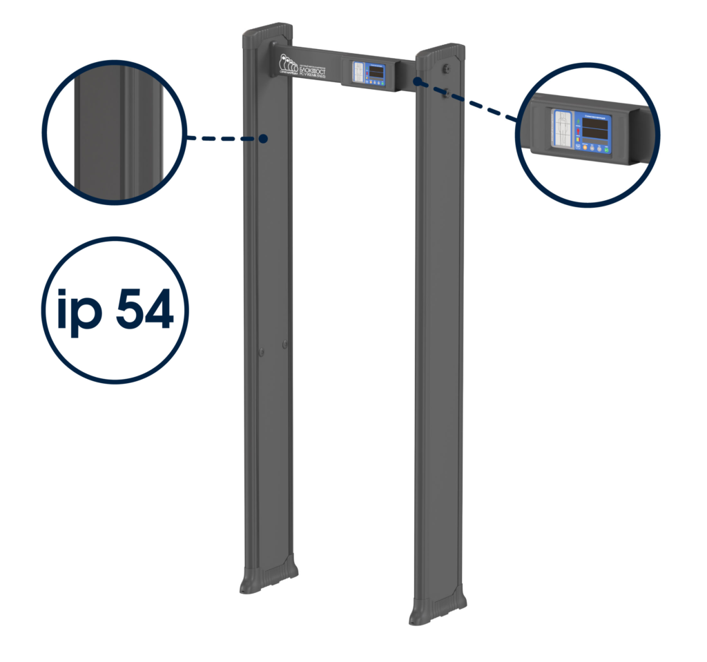 The body of the BLOCKPOST metal detectors of the MATRYOSHKA series has a shell protection rating of IP54. The panels have a moisture-resistant coating and special impregnation. Additional structural elements made of aluminum and durable plastic allow the product to be used in almost any conditions indoors and even outdoors, if the product is not directly exposed to precipitation and is not in conditions of high humidity. The degree of protection of the case can be further increased by means of special cases with transparent inserts.