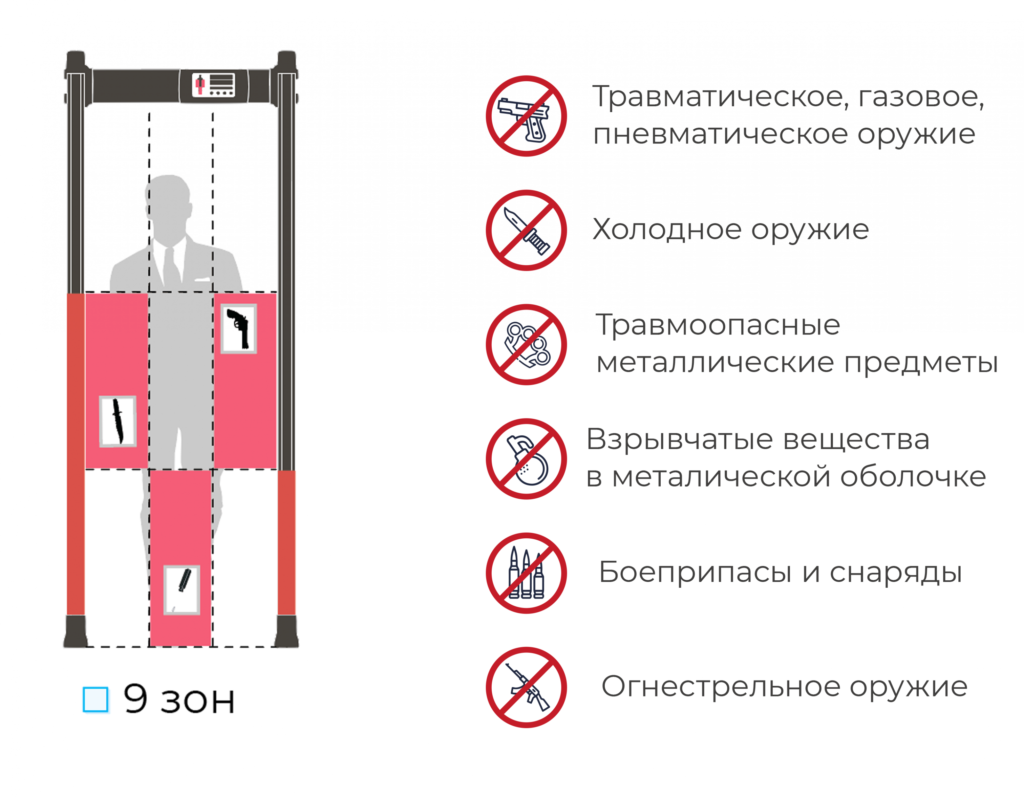 Electromagnetic transmitting and receiving coils located in the left and right antenna panels create a scanning continuous and uniform electromagnetic field in the control zone by radiation. When carrying metal or metal-containing objects through the control zone, the physical parameters of the scanning electromagnetic field change in the locations of the said objects. All physical changes that affect the specified parameters of the scanning electromagnetic field in the control zones (dimensions, weight, physical properties of magnetic and non-magnetic metals and alloys) are analyzed by the signal processing unit. The operation of this unit is built according to special algorithms using modern microprocessors and electronic components.