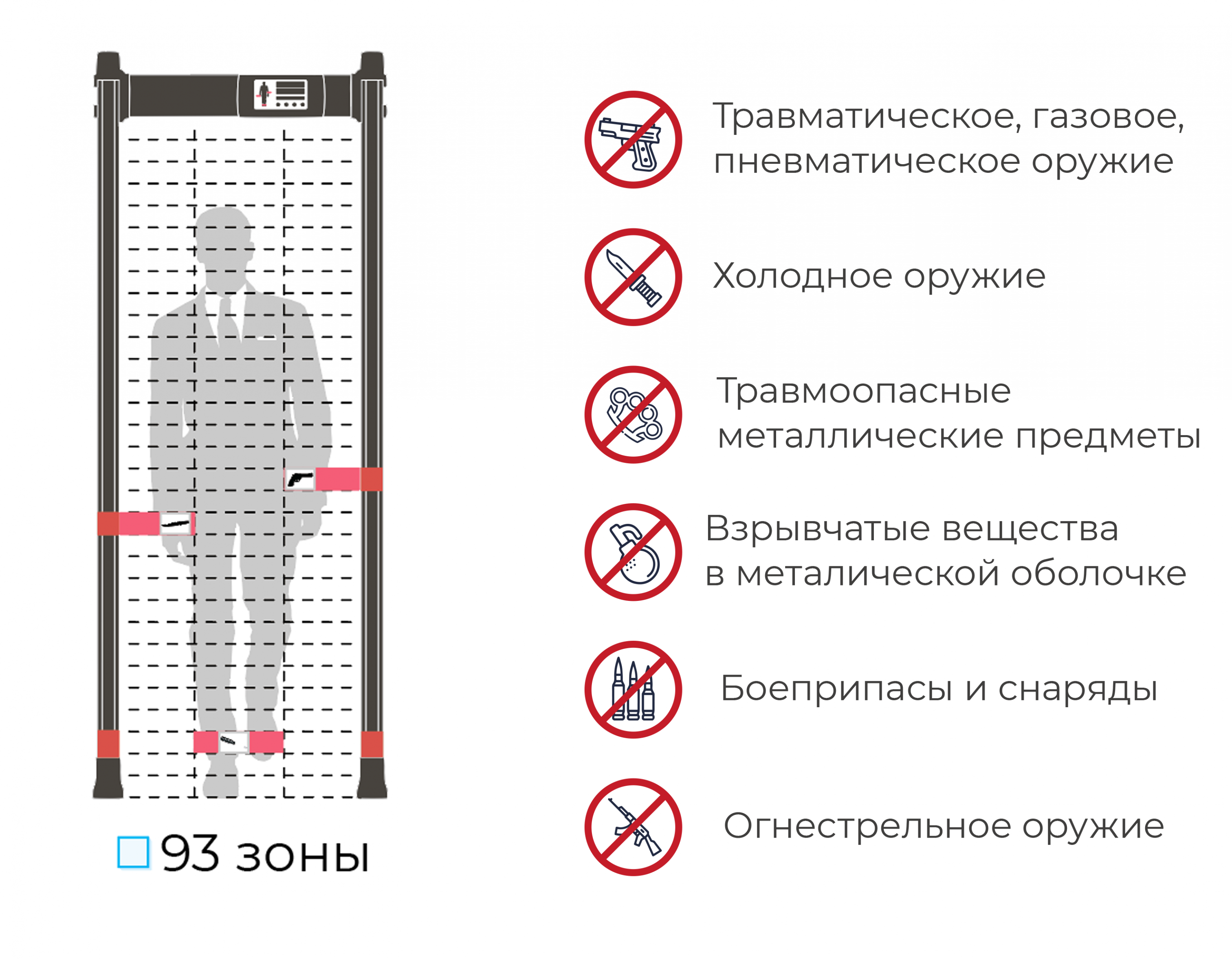 Thanks to the introduction of new design solutions for placing from 14 to 34 electromagnetic coils, it became possible to take into account the overlap of adjacent zones. Accordingly, each metal detector forms a uniform, multi-zone scanning field. The number of detection zones can vary from 3 to 93, which significantly increases the accuracy of determining the location of one or more metal objects on a person’s body, in his clothing or in luggage.