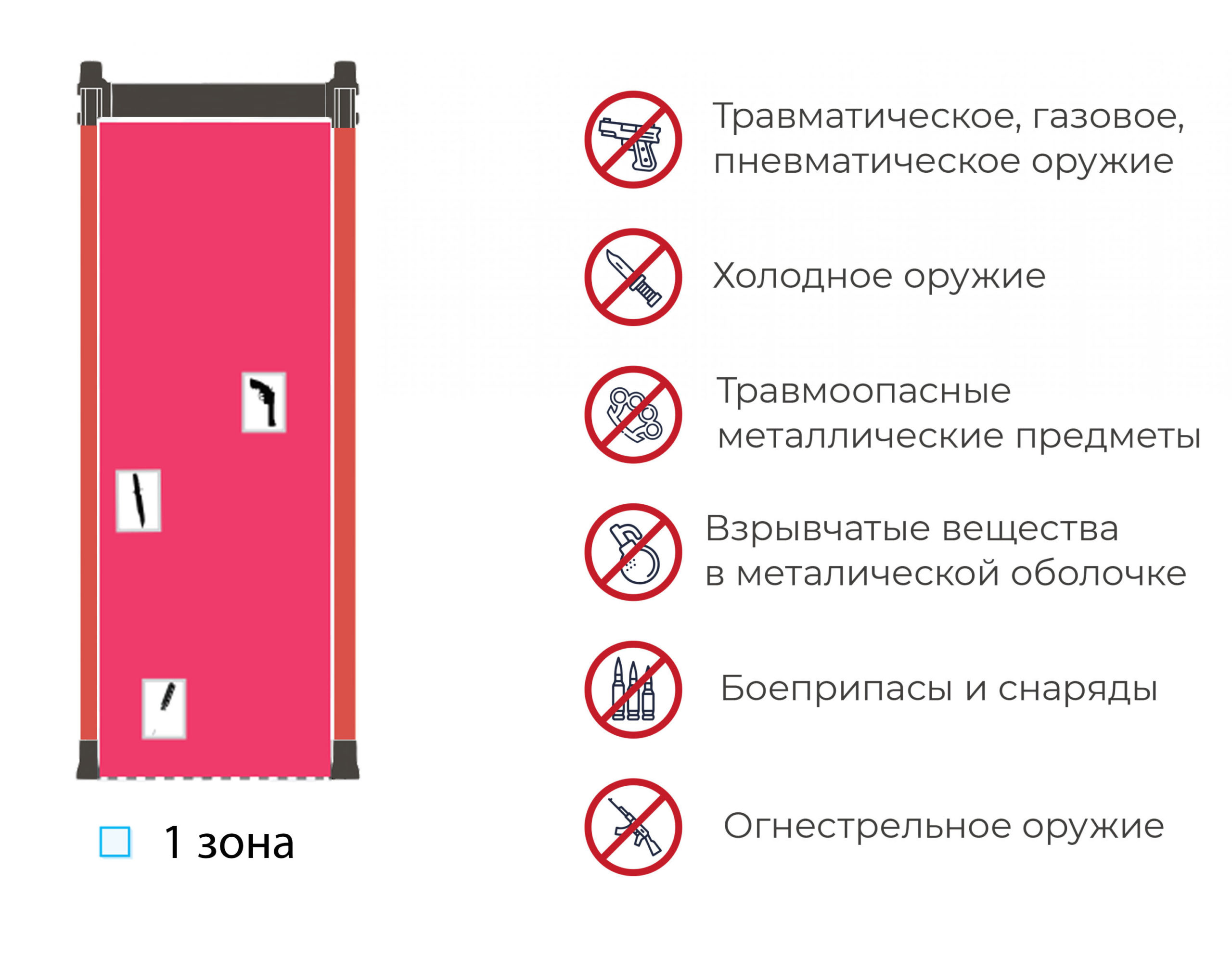 If a person with a prohibited item crosses the metal detector arch, the side panels will sound an alarm and block the turnstile or any other device used in parallel with the metal detector, making further movement of the visitor impossible.