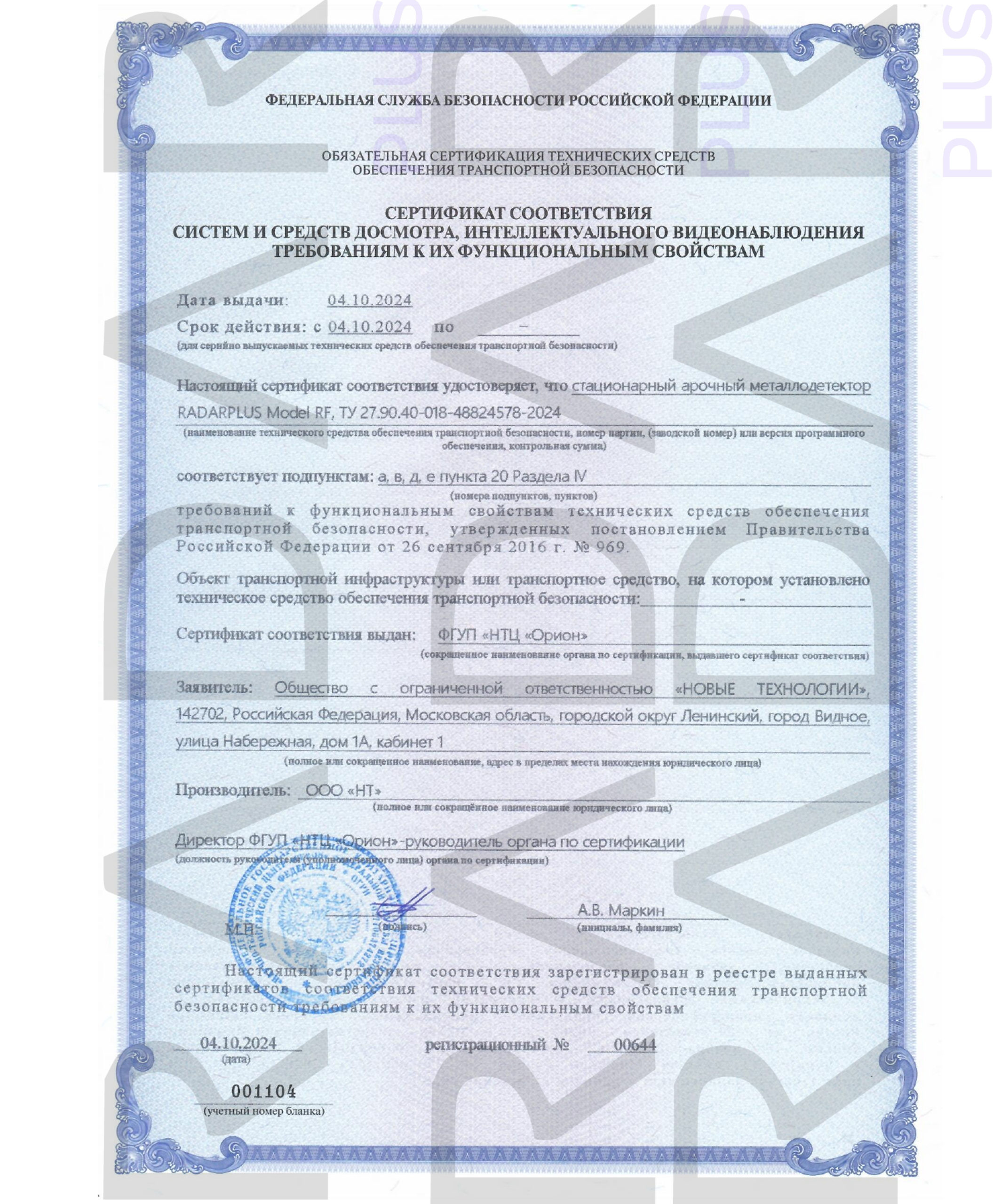 - Availability of a transport security certificate (RF PP No. 969);